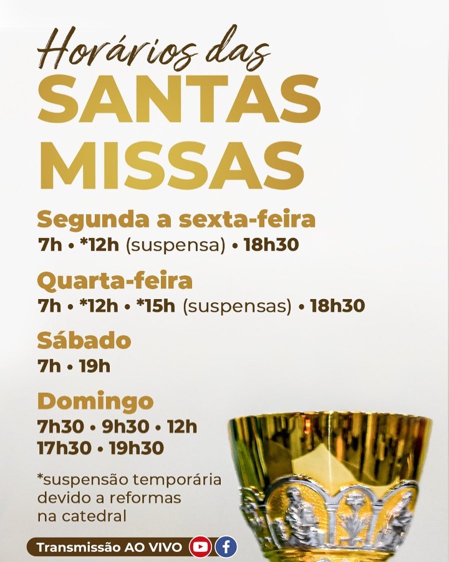 A Catedral de Maringá suspendeu temporariamente as missas das 12h durante a semana e das 15h às quartas-feiras, por causa das obras de revitalização dos espelhos d’água ao redor da igreja. Os horários das demais celebrações não foram alterados.
