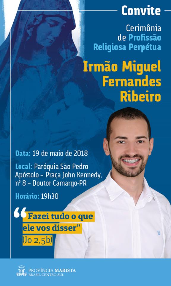 A Arquidiocese de Maringá compartilha a grata notícia da cerimônia de profissão religiosa perpétua do irmão marista Miguel Fernandes Ribeiro. A Santa Missa será celebrada sábado, 19 de maio, às 19h30 na paróquia São Pedro Apóstolo em Doutor Camargo-PR.