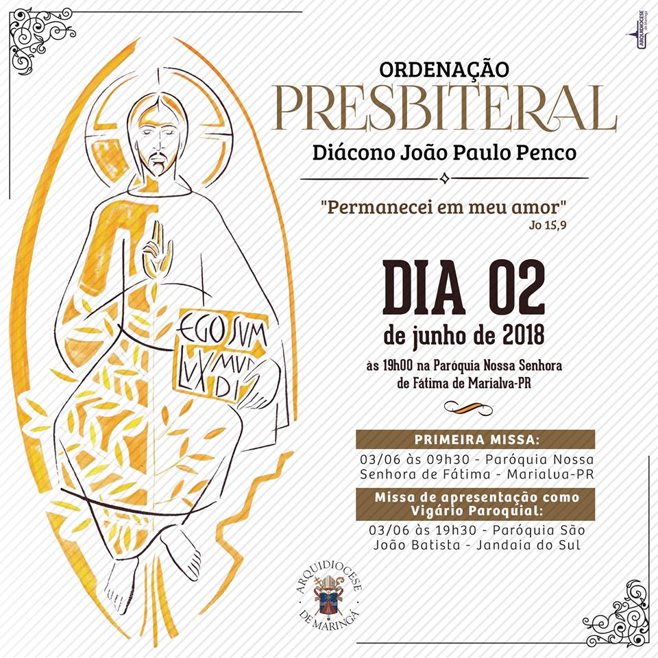 O diácono João Paulo Penco será ordenado presbítero pela imposição das mãos do Arcebispo de Maringá, Dom Anuar Battisti, nesse sábado (02) na paróquia Nossa Senhora de Fátima em Marialva-PR. A Santa Missa está marcada para às 19h. A primeira Missa presidida pelo padre João Paulo será domingo (03) às 9h30, na mesma igreja.