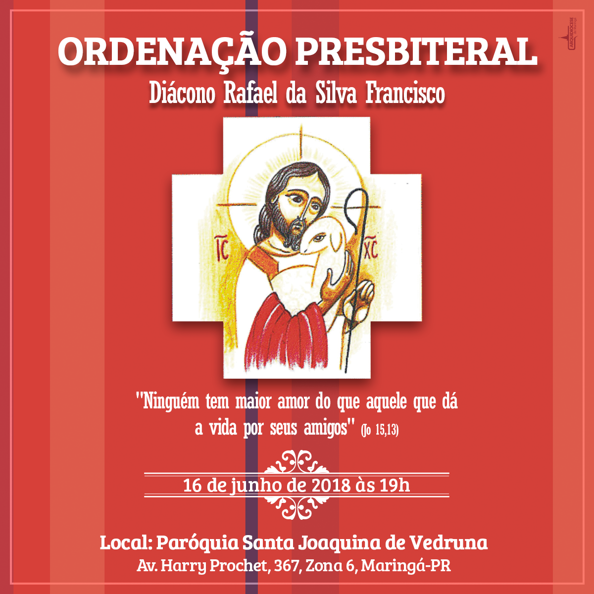 O diácono Rafael da Silva Francisco será ordenado presbítero no próximo sábado (16) às 19h na paróquia Santa Joaquina de Vedruna em Maringá. A celebração será presidida pelo Arcebispo de Maringá, Dom Anuar Battisti.