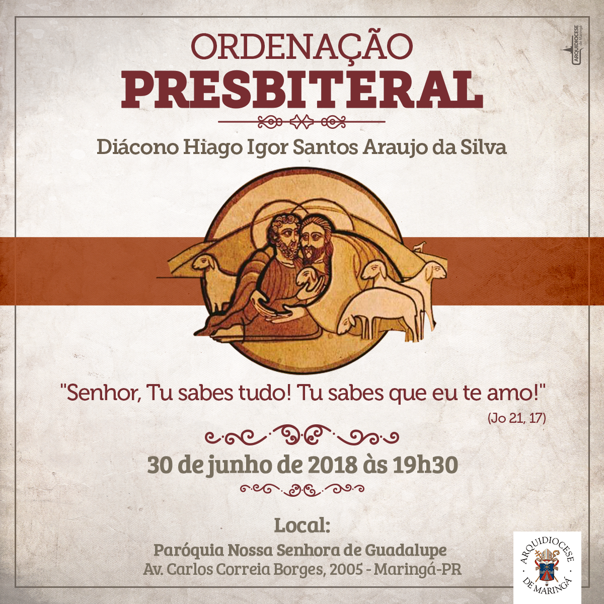 O diácono Hiago Igor Santos Araujo da Silva será ordenado padre pela imposição das mãos do Arcebispo de Maringá, Dom Anuar Battisti. A Santa Missa será celebrada na paróquia Nossa Senhora de Guadalupe em Maringá, às 19h30. A igreja fica na Avenida Carlos Borges, 2005, jardim Itália.