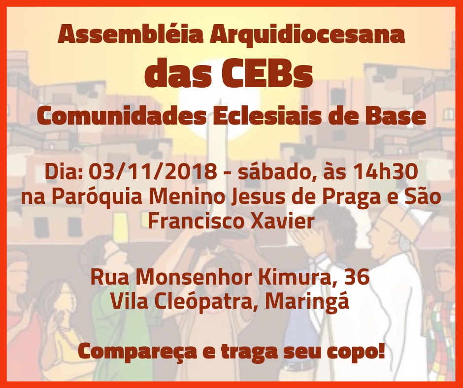 As CEBs (Comunidades Eclesiais de Base) da Arquidiocese de Maringá realizam assembleia arquidiocesana no próximo sábado, 03 de novembro, às 14h30 na paróquia Menino Jesus de Praga e São Francisco Xavier, em Maringá.