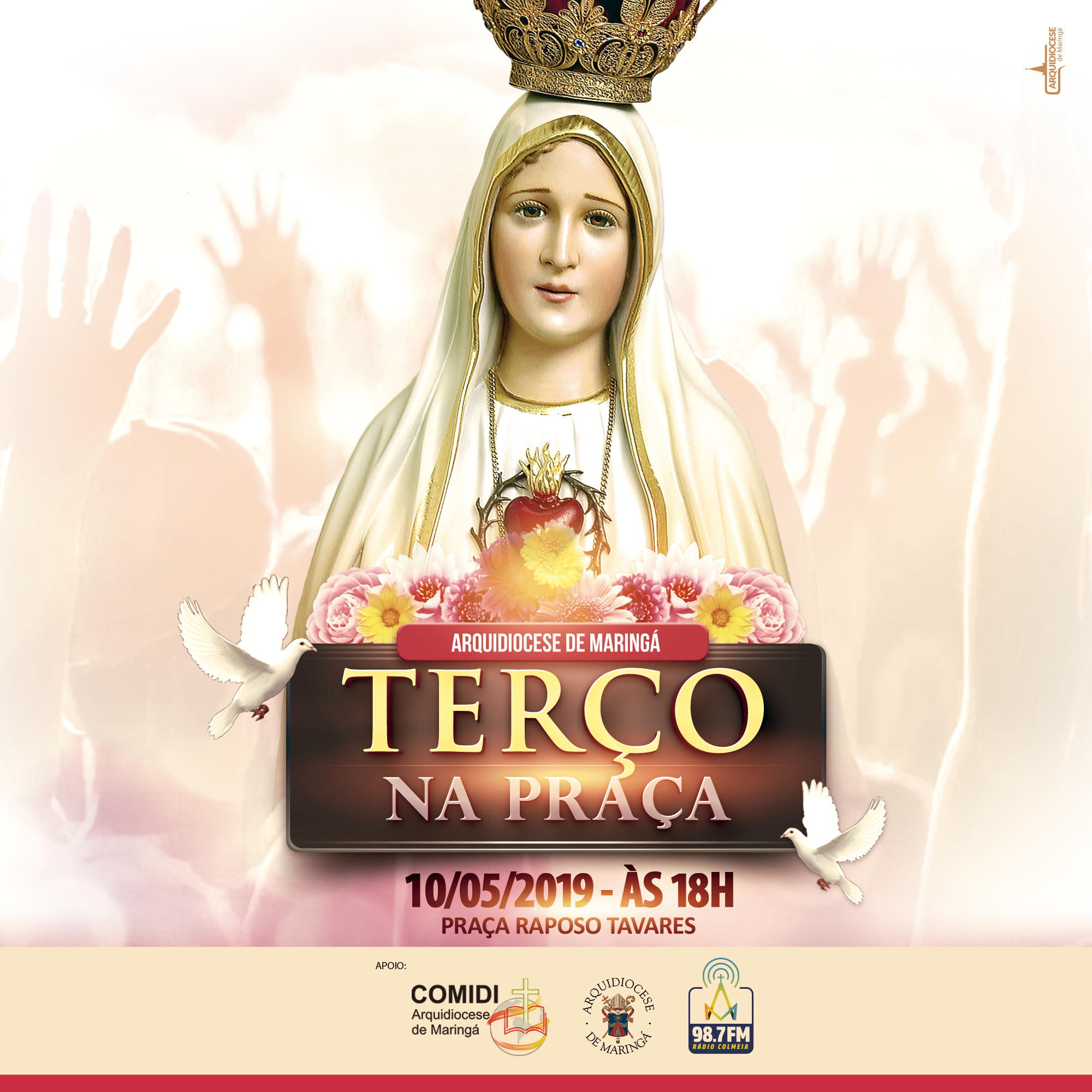 A Arquidiocese de Maringá, por meio do Conselho Missionário Arquidiocesano (COMIDI), promoverá no dia 10 de maio (sexta-feira) a 15ª edição do Terço na Praça.