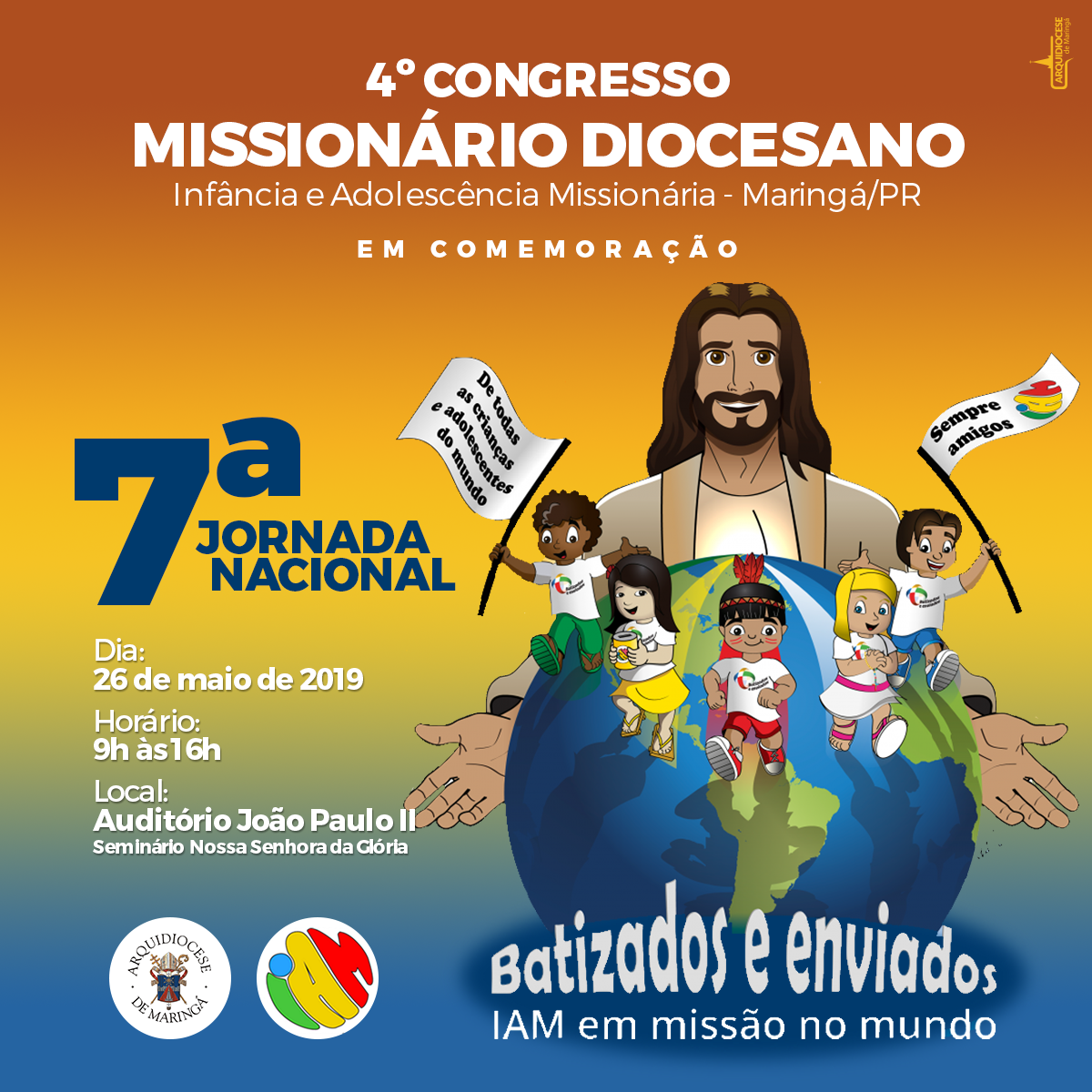 No dia 26 de maio será realizado o 4º congresso Arquidiocesano da Infância e Adolescência Missionária, em comemoração a 7ª Jornada Nacional da IAM, que completa 176 anos.