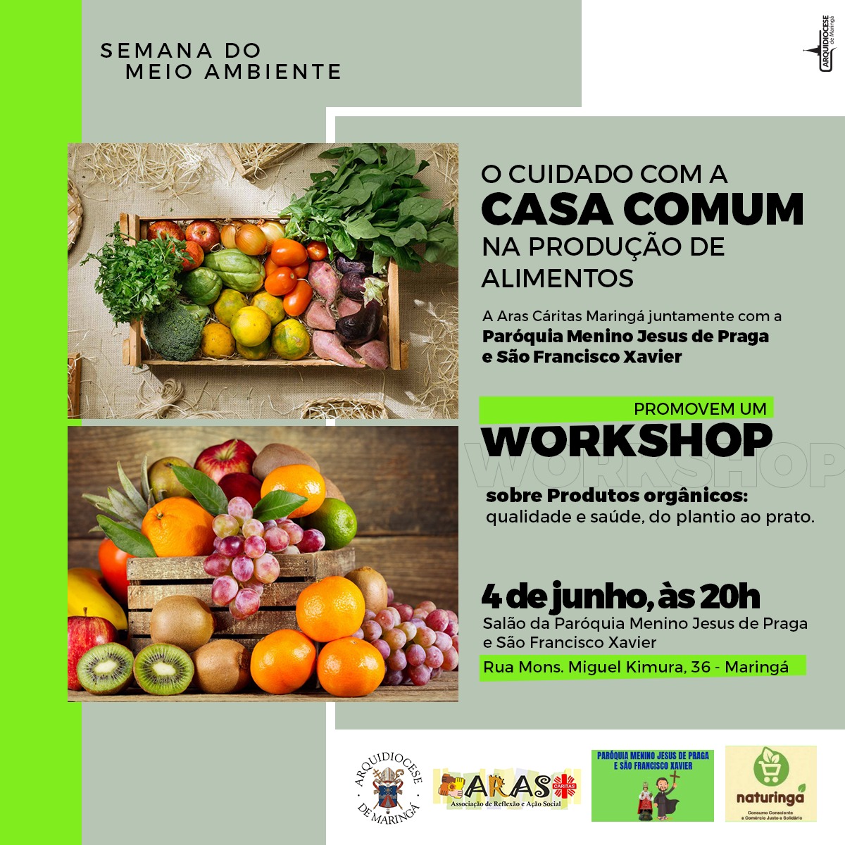 Por ocasião da Semana Nacional do Meio Ambiente - de 1 a 5 de junho – será realizado um workshop com o tema “O cuidado com a Casa Comum na produção de alimentos”, terça-feira (04 de junho) às 20h no salão da paróquia Menino Jesus de Praga e São Francisco Xavier, em Maringá.