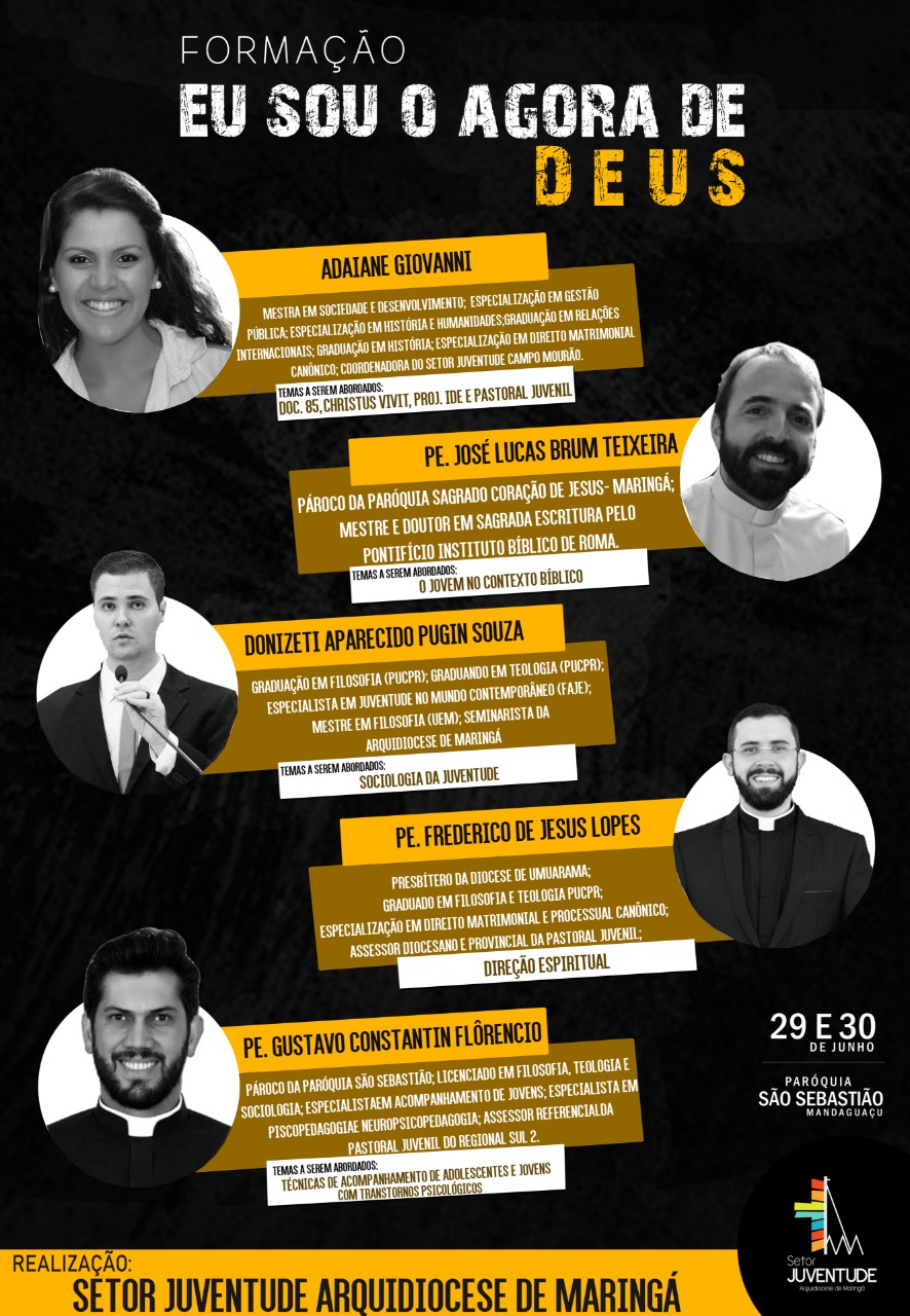 O Setor Juventude da Arquidiocese de Maringá irá promover nos dias 29 e 30 de junho uma formação arquidiocesana para lideranças com o tema “Eu sou o agora de Deus”. A experiência de formação será no Centro de Pastoral Papa Francisco da paróquia São Sebastião, em Mandaguaçu.
