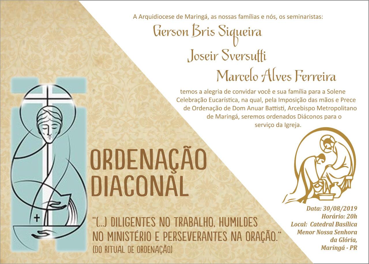 A Arquidiocese de Maringá convida para a ordenação diaconal dos seminaristas Gerson Bris Siqueira, Joseir Sversutti e Marcelo Alves Ferreira. A Santa Missa será celebrada sexta-feira, 30 de agosto, às 20h na Catedral Basílica Menor Nossa Senhora da Glória.