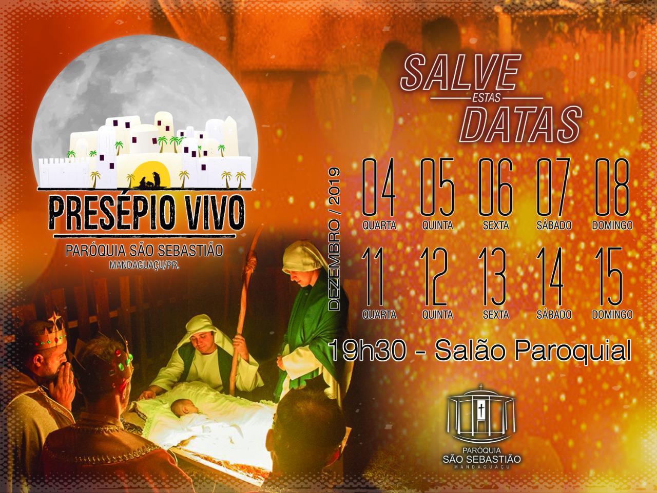 De 04 a 08 e de 11 a 15 de dezembro voluntários da paróquia São Sebastião, em Mandaguaçu, farão apresentações do Presépio Vivo. O Nascimento de Jesus é contado de uma forma diferente, a partir de cenas que remetem à época em que Cristo nasceu, em Belém de Judá, no tempo do rei Herodes.