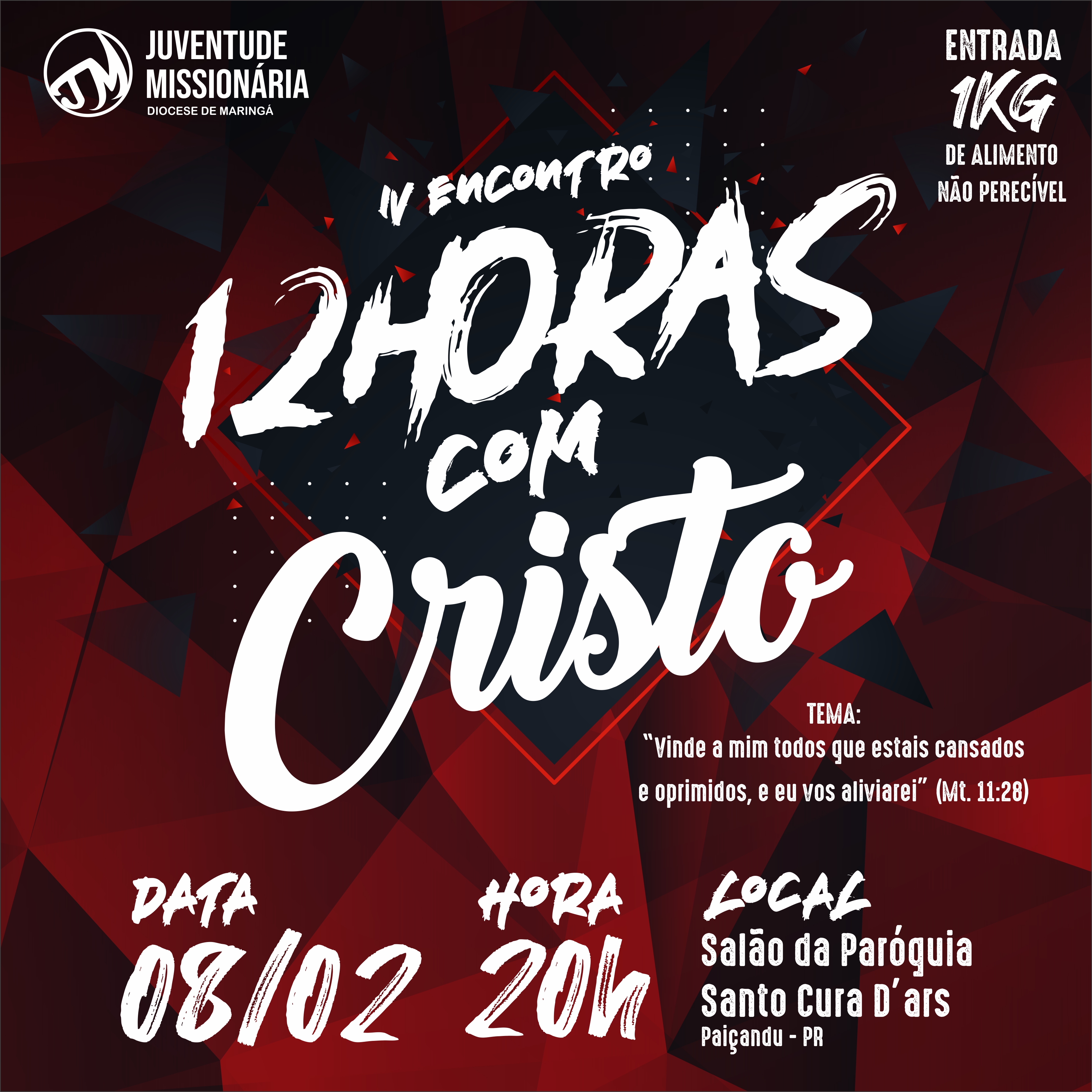 A Juventude Missionária da Arquidiocese de Maringá, animada pelas Pontifícias Obras Missionárias, irá promover a 4ª edição do encontro “12 horas com Cristo”. O evento, destinado aos jovens a partir dos 13 anos, será realizado no salão da paróquia Santo Cura d’Ars, em Paiçandu, dias 08 e 09 de fevereiro.