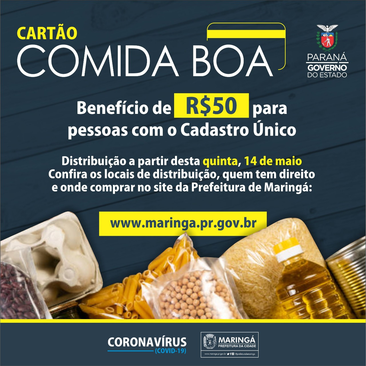 O valor poderá ser usado na compra produtos alimentícios durante a pandemia do coronavírus. Em Maringá, os cartões serão entregues em 80 locais, como unidades de educação, centros de referência (Cras) e associações e igrejas. Para saber se você tem direito ao auxílio, entre no site http://www.cartaocomidaboa.pr.gov.br/form/beneficiarios.php e digite seu CPF ou procure o Cras mais próximo.