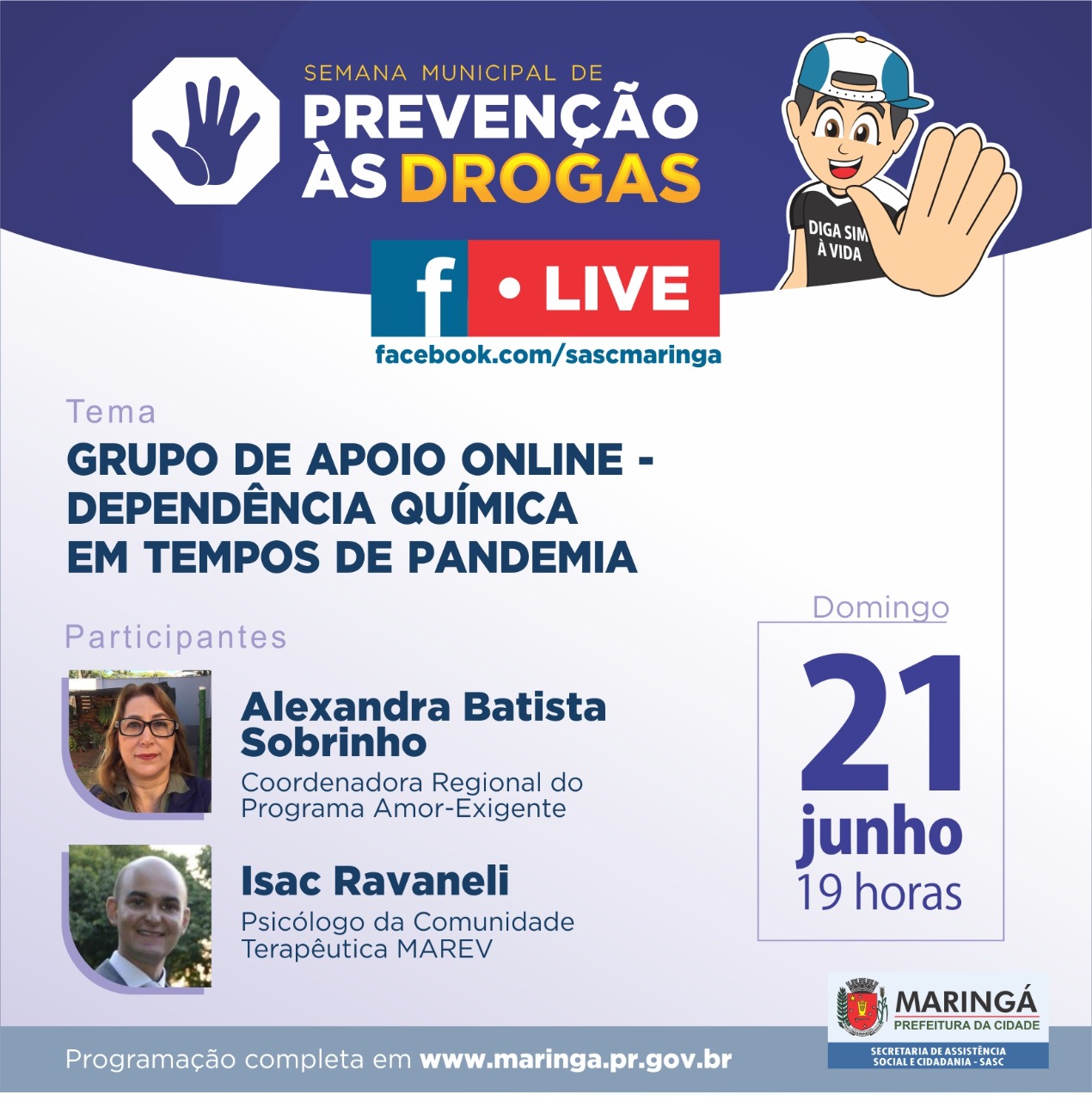 A Arquidiocese de Maringá apoia a Semana Municipal de prevenção às drogas, que será realizada de 20 a 26 de junho, em Maringá. Domingo (21), haverá uma Live com a presença da coordenadora regional do Amor Exigente, Alexandra Sobrinho, e do psicólogo da comunidade terapêutica MAREV, Isac Ravaneli. Início às 19h pelo facebook.com/sascmaringa