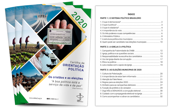 O Regional Sul 2 CNBB acaba de lançar uma Cartilha de Orientação Política em vista das eleições municipais de 2020. Com linguagem simples e didática, o subsídio é destinado a eleitores e candidatos, grupos de reflexão, paróquias e comunidades, a fim de orientar politicamente os cristãos e todos os cidadãos e contribuir para a formação de uma sadia consciência política.