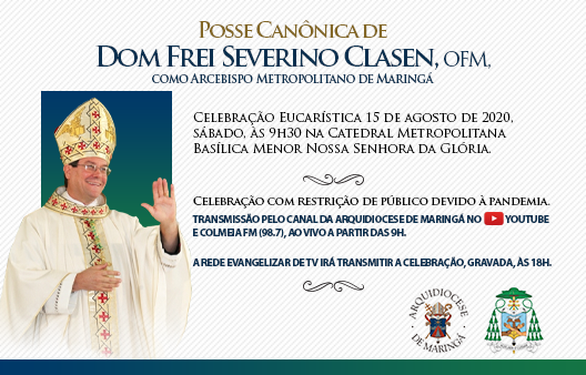 A Santa Missa em que Dom Severino Clasen tomará posse como Arcebispo de Maringá será transmitida ao vivo pelo canal da Arquidiocese de Maringá no YouTube https://www.youtube.com/ArquidioceseMaringa e pela Rádio Colmeia FM (98,7), a partir das 9h.