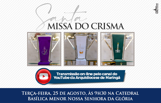 A Santa Missa do Crisma na Arquidiocese de Maringá será celebrada na próxima terça-feira, 25 de agosto, às 9h30 na Catedral Metropolitana Basílica Menor Nossa Senhora da Glória. A celebração, também conhecida como Missa dos Santos Óleos, será presidida pelo Arcebispo de Maringá, Dom Severino Clasen, e será aberta aos fiéis, dentro do limite da capacidade permitida segundo as regras sanitárias vigentes.