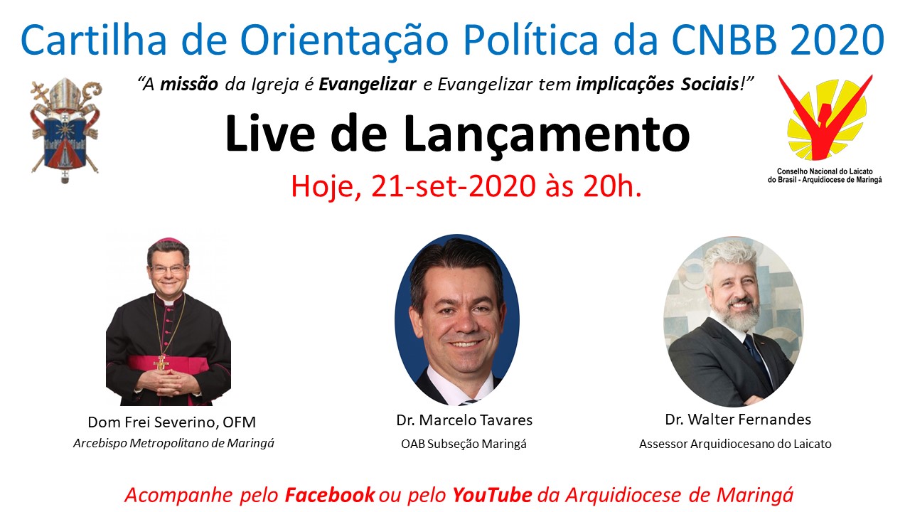 Nesta segunda-feira, 21 de setembro de 2020, o Conselho de Leigos da Arquidiocese de Maringá irá realizar uma Live de lançamento da Cartilha de Orientação Política 2020, com a presença do Arcebispo de Maringá, Dom Frei Severino Clasen. Também haverá a participação do advogado Marcelo Tavarez, OAB Subseção Maringá, e do advogado Walter Fernandes, Assessor Arquidiocesano do CNLB.