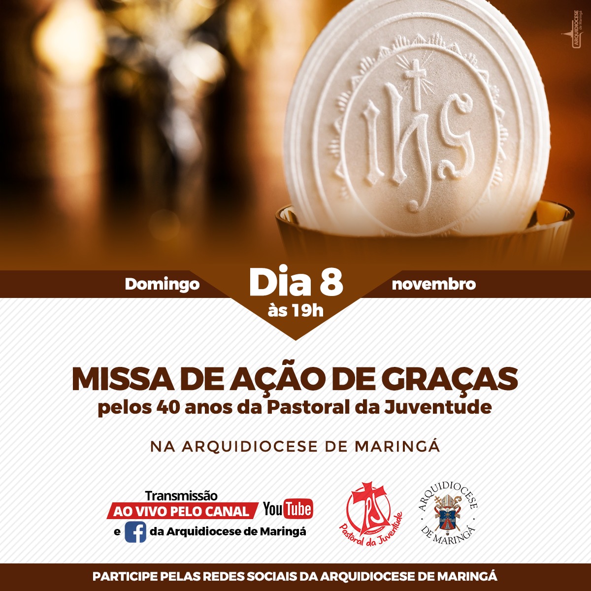 Domingo, 08 de novembro, será celebrada a Missa em ação de graças pelos 40 anos da Pastoral da Juventude na Arquidiocese de Maringá. A celebração terá início às 19h, na paróquia São Mateus Apóstolo.