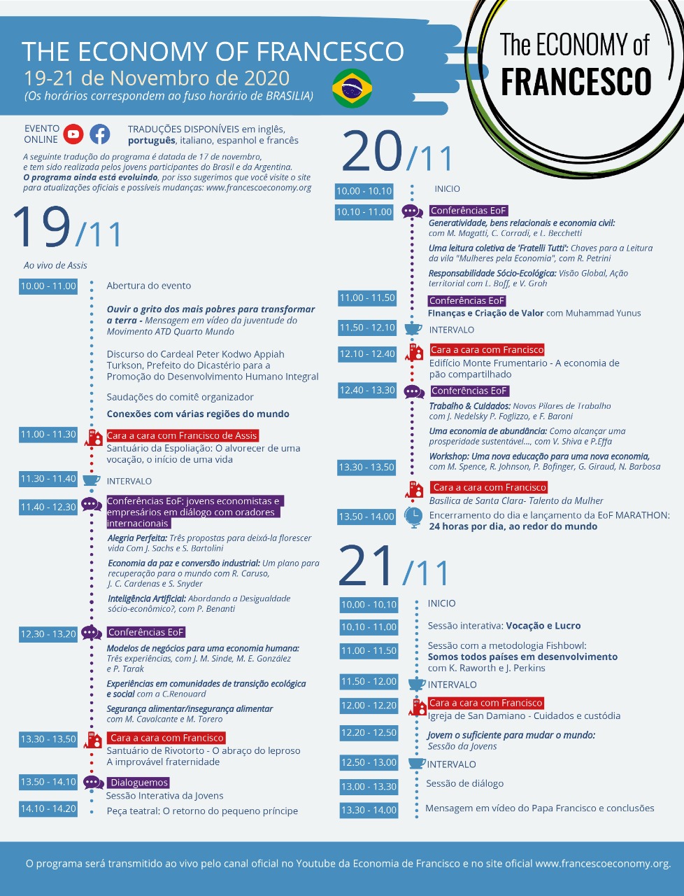 No centro deste evento internacional, temas cruciais, como trabalho, finanças, educação e inteligência artificial. Devido à emergência sanitária causada pela Covid-19, será realizado online - ao vivo e em streaming. Foi confirmada a participação “virtual” do Papa Francisco. Entre os palestrantes estão Muhammad Yunus, economista e Prêmio Nobel da Paz 2006, Vabdana Shiva, membro do Fórum Internacional sobre Globalização, e Stefano Zamagni, presidente da Pontifícia Academia de Ciências Sociais. O próximo encontro, que será presencial, deve ocorrer no final de 2021 em Assis-Itália.