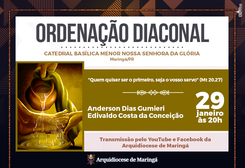 Os seminaristas Anderson Dias Gumieri, da paróquia Nossa Senhora da Liberdade (Maringá), e Edivaldo Costa da Conceição, da paróquia Jesus Bom Pastor (Paiçandu), serão ordenados diáconos sexta-feira, 29 de janeiro, às 20h, na Catedral Basílica Menor Nossa Senhora da Glória, em Maringá. O diaconato, primeiro grau da Ordem, precede a ordenação presbiteral.