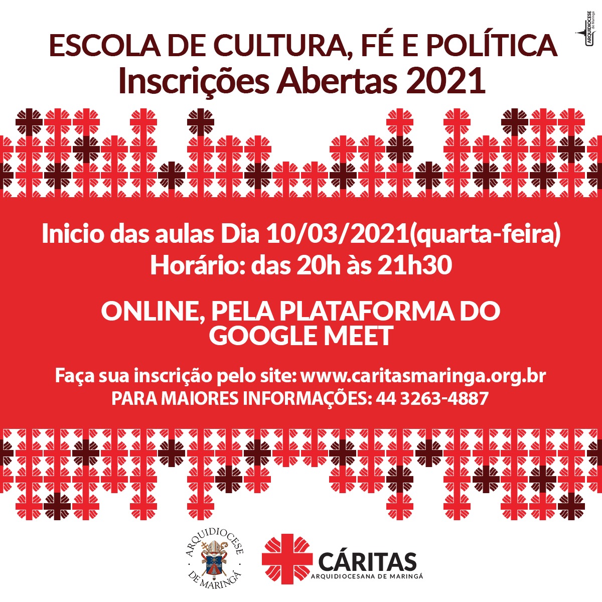 Estão abertas as inscrições para a turma 2021 da Escola de Cultura, Fé e Política da Arquidiocese de Maringá. Este ano as aulas serão realizadas no formato remoto, através da plataforma do Google Meet, às quartas-feiras, das 20h às 21h30, com início dia 10 de março.