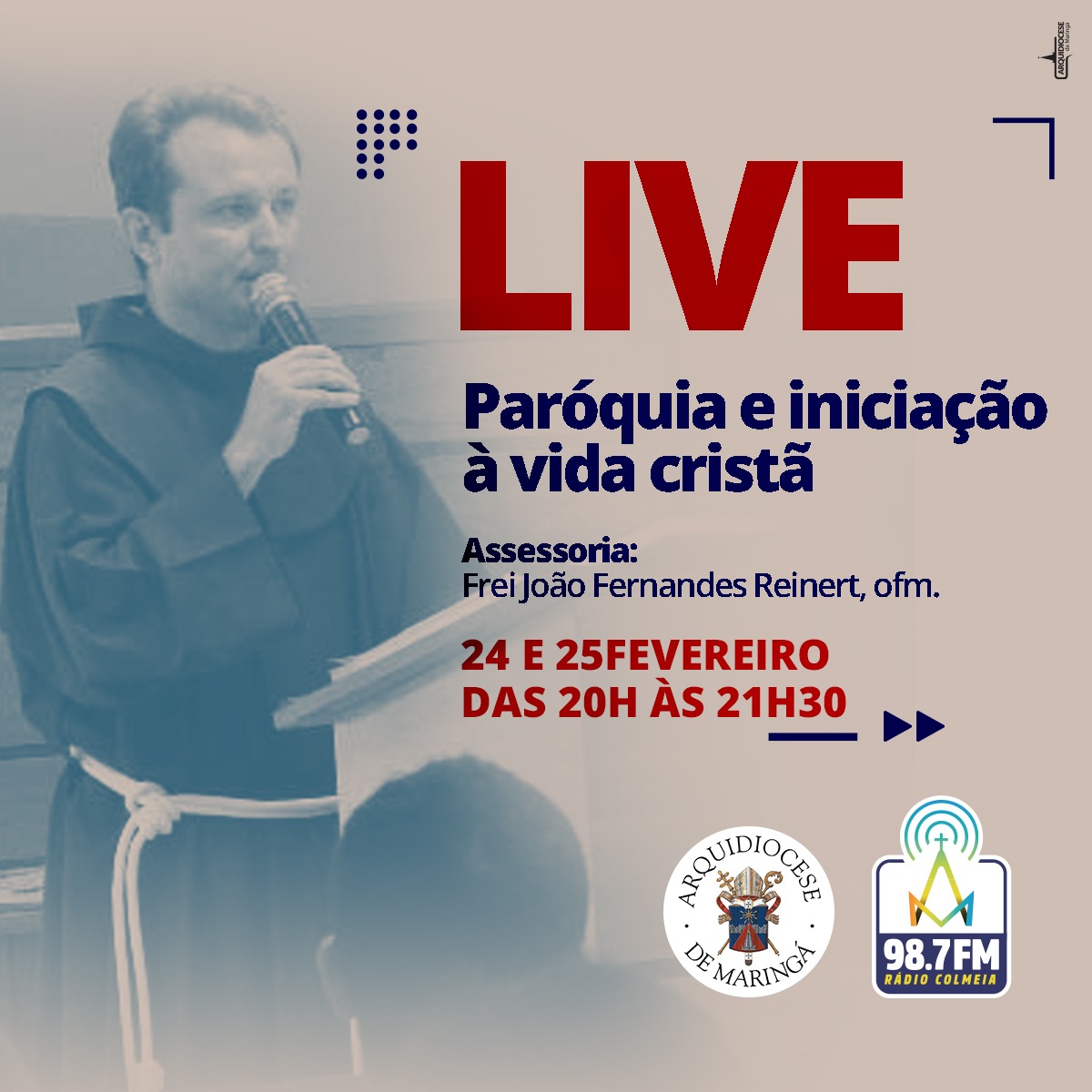 A Arquidiocese de Maringá irá promover duas Lives com a participação do frei João Fernandes Reinert, ofm, sobre “Paróquia e iniciação à vida cristã”. Frei João Fernandes é mestre e doutor em teologia pela PUC-Rio.