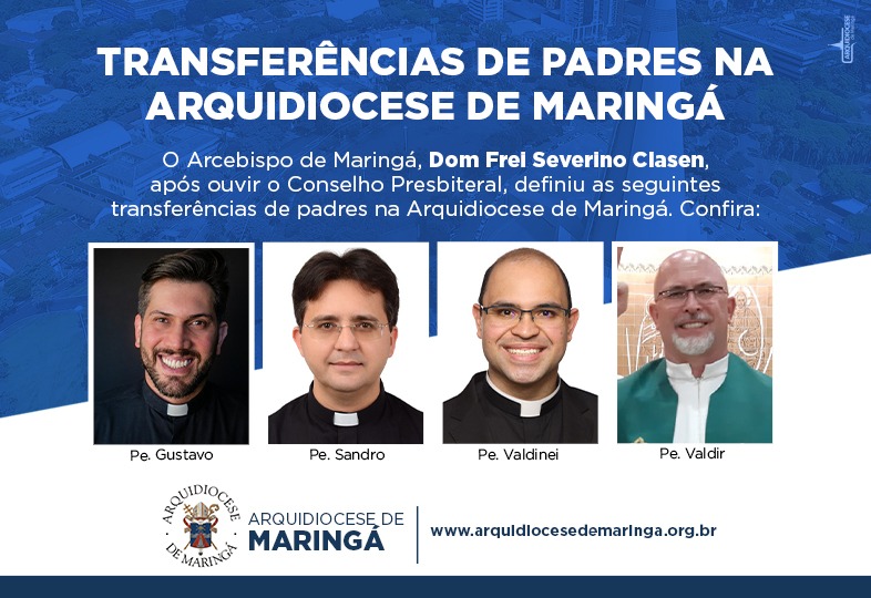 O Arcebispo de Maringá, Dom Frei Severino Clasen, após ouvir o Conselho Presbiteral, definiu as seguintes transferências de padres na Arquidiocese de Maringá.
