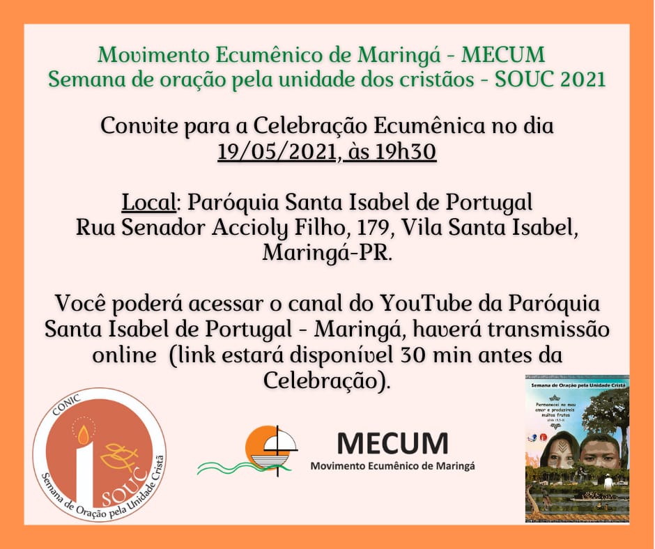 O Movimento Ecumênico de Maringá (Mecum) promoverá Celebração Ecumênica por ocasião Semana de Oração pela Unidade Cristã (SOUC), edição 2021, realizada de 16 a 23 de maio. A celebração está marcada para quarta-feira, dia 19 de maio, na igreja matriz da paróquia Santa Isabel de Portugal, às 19h30. O tema da semana de oração deste ano: “Permanecei no meu amor e produzireis muitos frutos” (cf. João 15,5-9).