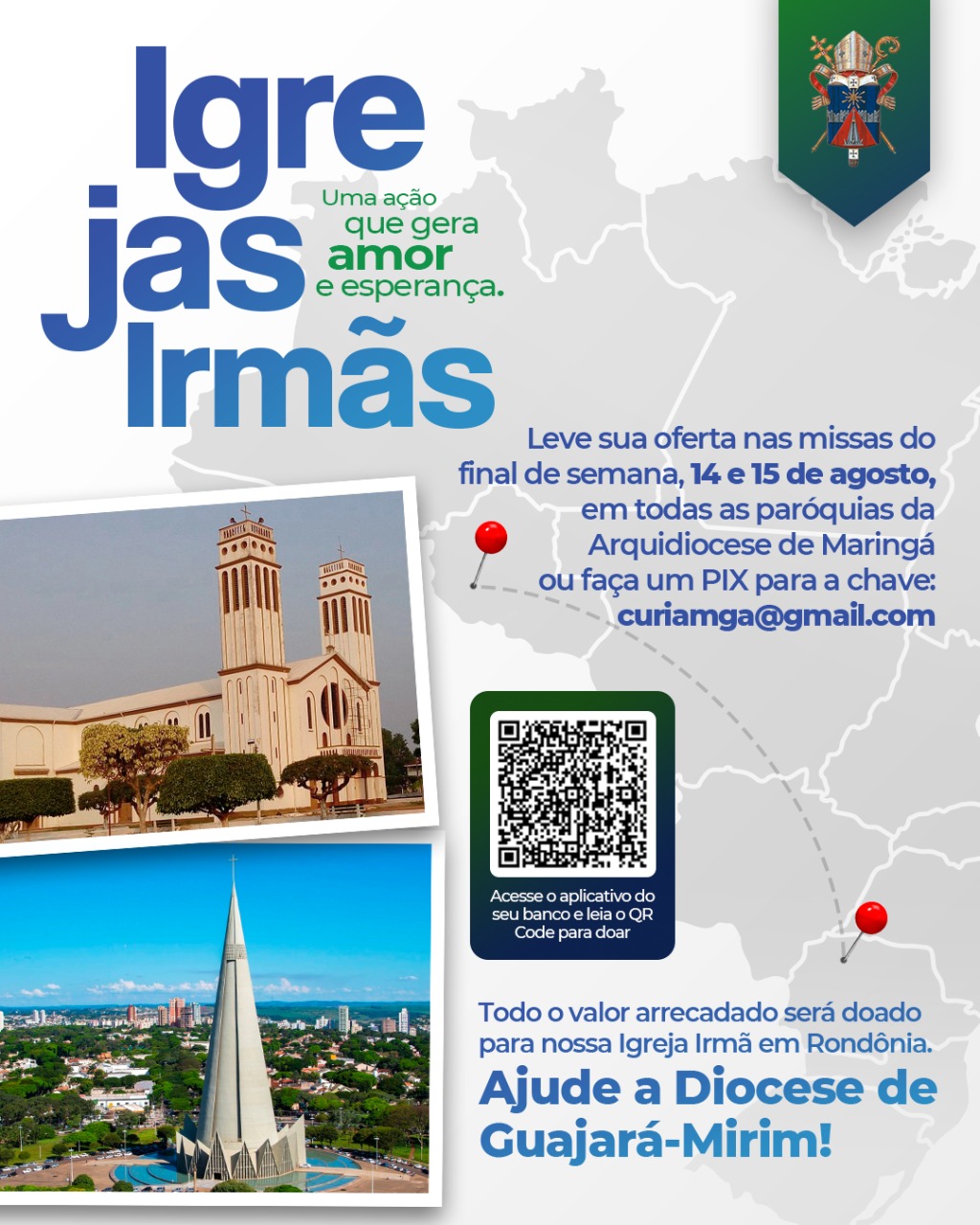 A coleta de todas as missas das paróquias da Arquidiocese de Maringá nos dias 14 e 15 de agosto será destinada à Diocese de Guajará-Mirim, Rondônia. A oferta anual para Guajará-Mirim ocorre por ocasião do Dia de Nossa Senhora da Glória, padroeira da cidade e da Arquidiocese de Maringá.