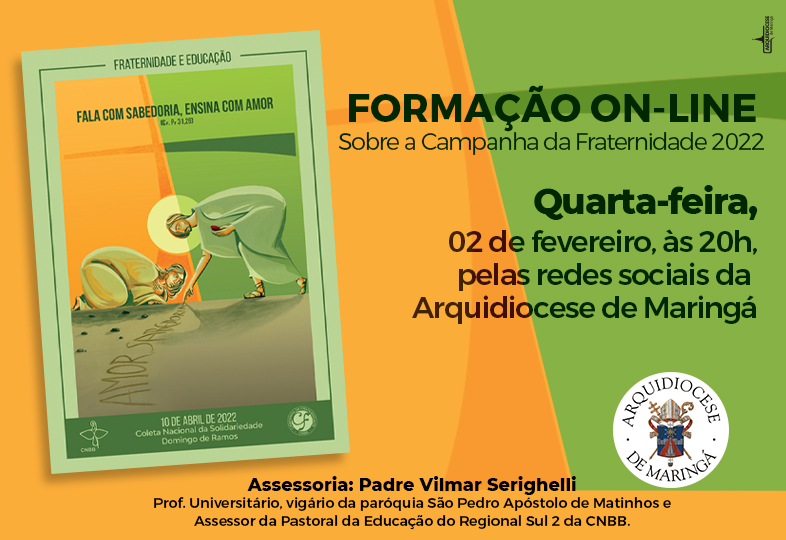 O Movimento Cursilhos de Cristandade e a Pastoral da Educação da Arquidiocese de Maringá convidam para a formação on-line sobre a Campanha da Fraternidade 2022, cujo tema é “Fraternidade e Educação” e o lema “Fala com sabedoria, ensina com amor” (Pr 31,26). A formação será transmitida pelas redes sociais da Arquidiocese de Maringá quarta-feira, 02 de fevereiro, às 20h.
