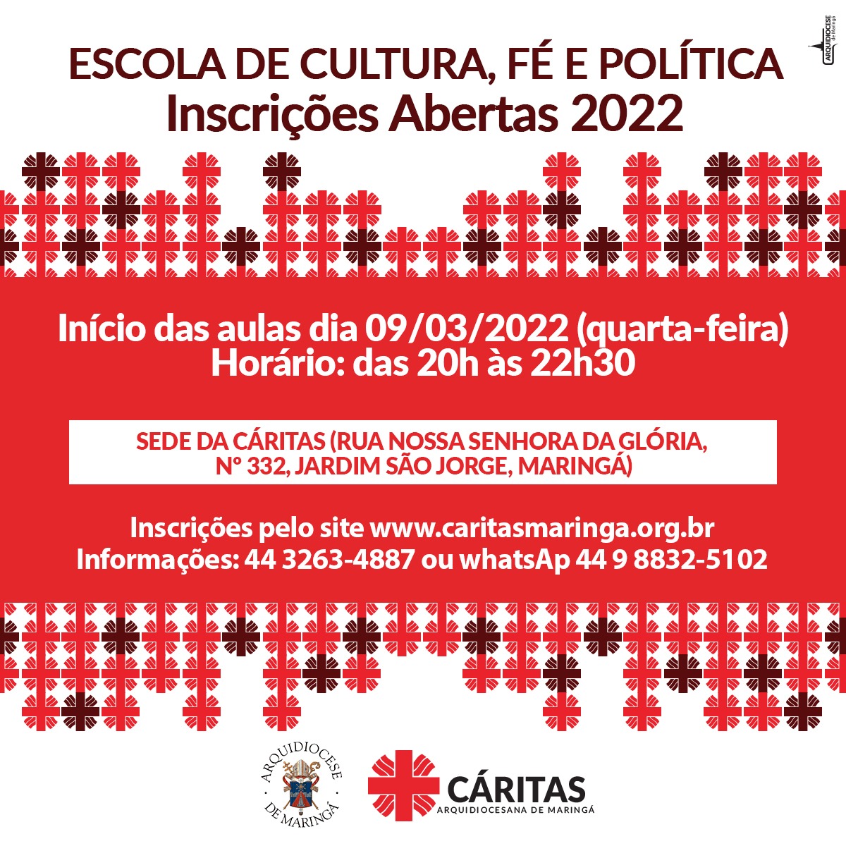 Estão abertas as matrículas para a Escola de Cultura, Fé e Política 2022. As aulas terão início no dia nove de março, quarta-feira, presencialmente na sede da Cáritas - Rua Nossa Senhora da Glória, 332 - Jardim São Jorge, Maringá.