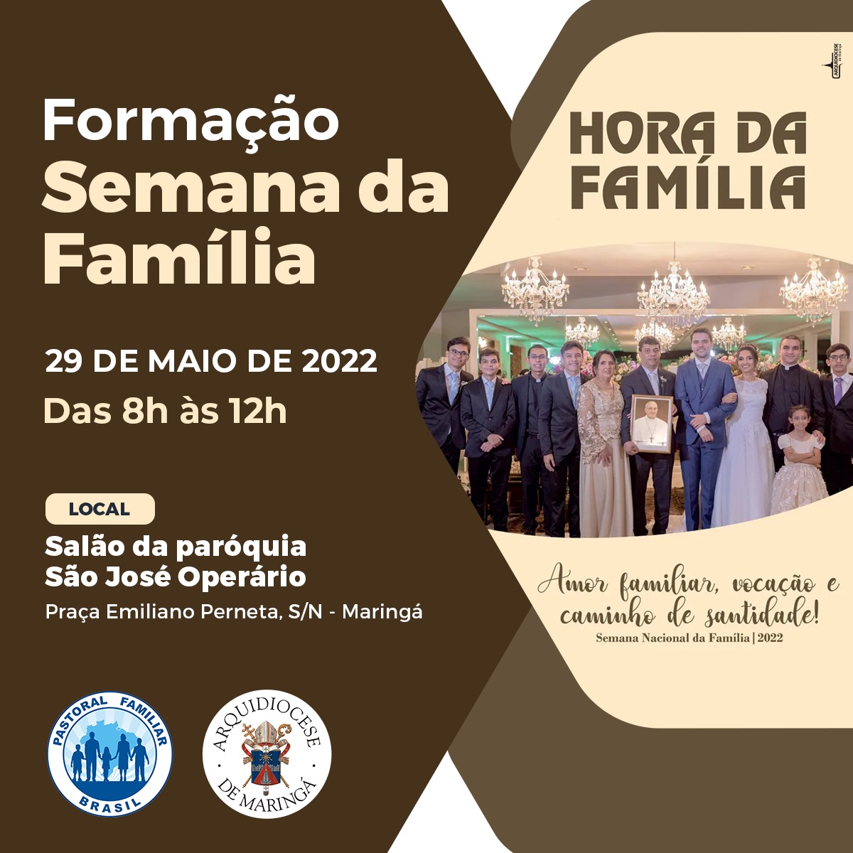 A Pastoral Familiar da Arquidiocese de Maringá irá promover formação sobre a temática da Semana Nacional da Família de 2022 - “Amor familiar, vocação e caminho de santidade” - domingo, dia 29 de maio, no salão da paróquia São José Operário.