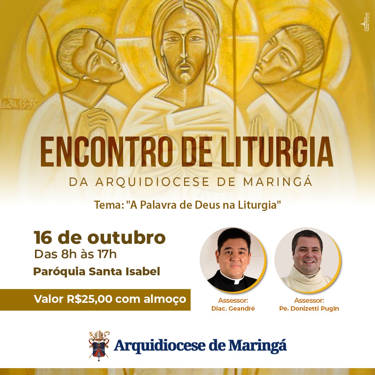 A Pastoral de Liturgia e Canto da Arquidiocese de Maringá promoverá Encontro de Liturgia com o tema “Palavra de Deus na Liturgia", domingo,16 de outubro, das 8h às 17h no salão paroquial da paróquia Santa Isabel de Portugal, com Santa Missa às 8h.