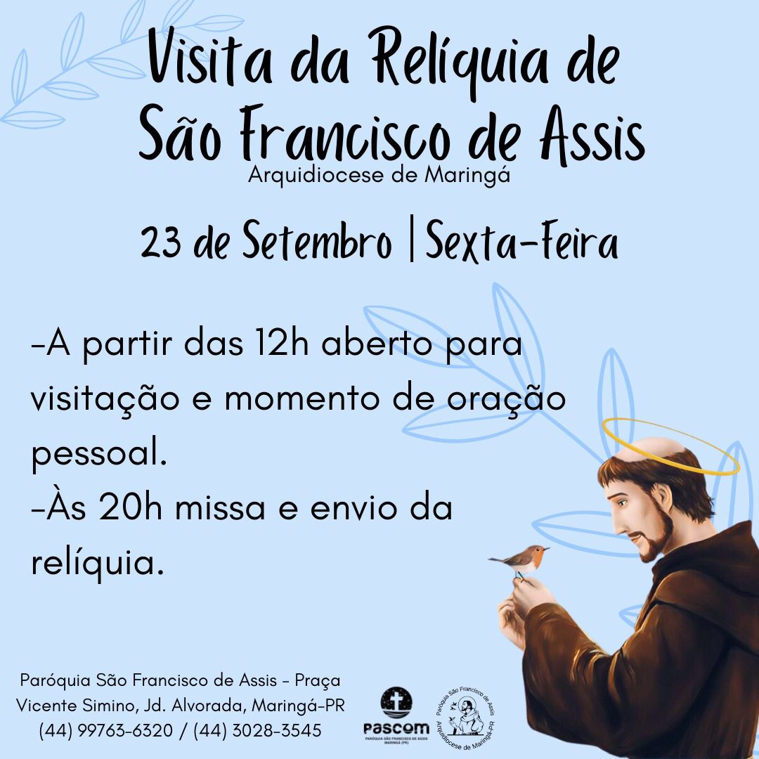 A relíquia que virá a Maringá é um fragmento de um osso de São Francisco e estará em exposição a partir das 12h, na igreja matriz. No mesmo dia, às 20h será celebrada Santa Missa de envio da relíquia, que depois irá para outra diocese.
