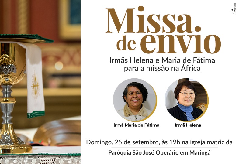 Domingo, 25 de setembro, às 19h na igreja matriz da paróquia São José Operário em Maringá, será celebrada a Santa Missa de envio das irmãs Maria de Fátima da Costa e Helena Yukie Makiyama, para a missão do Regional Sul 2 da CNBB, em Guiné-Bissau, África.
