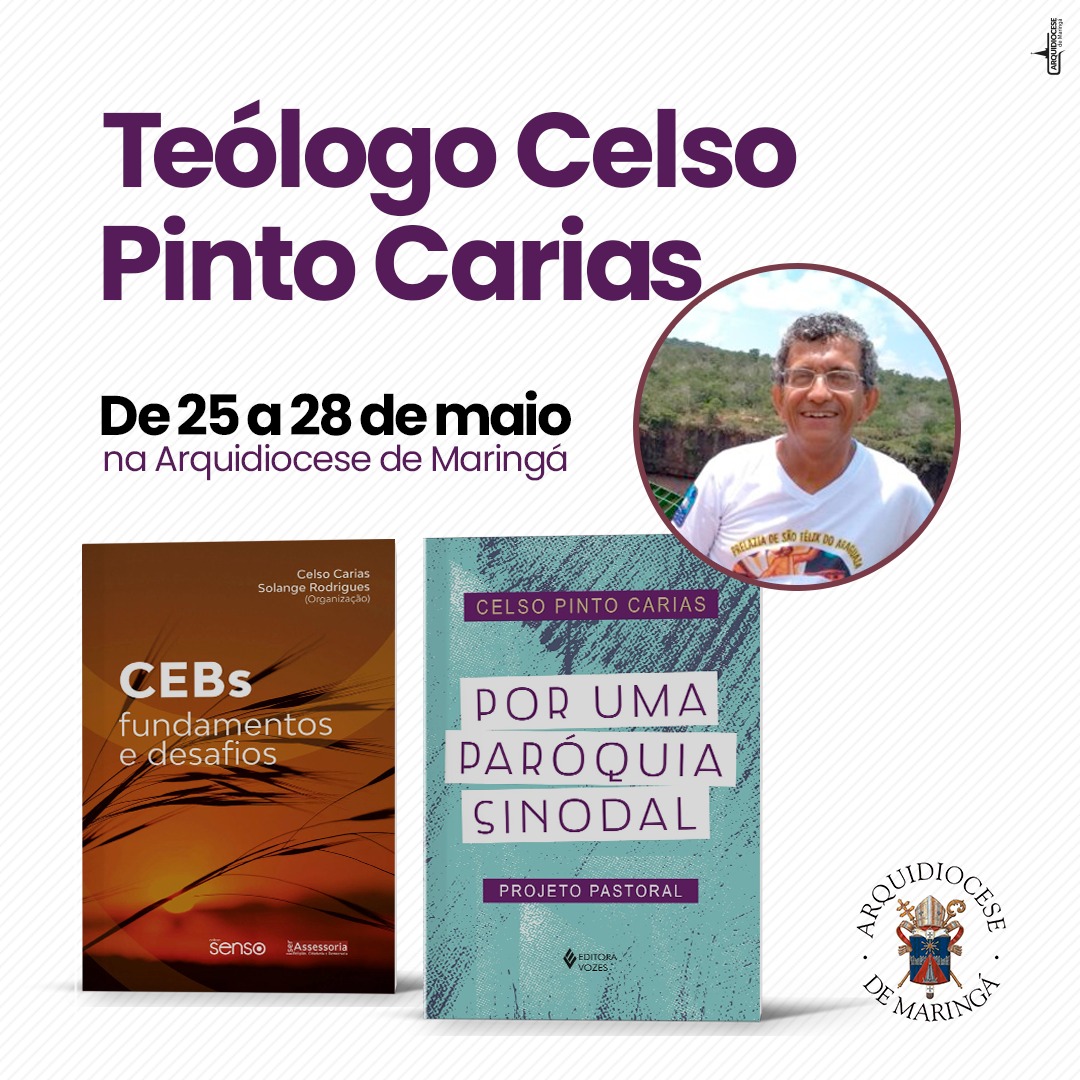 As Comunidades Eclesiais de Base (CEBs) da Arquidiocese de Maringá e a Escola de Formadores e Articuladores para as CEBs, promovem roda de conversa com o teólogo Celso Pinto Carias e lançamento de seus livros “Por uma Paróquia Sinodal” e “CEBs fundamentos e desafios”.