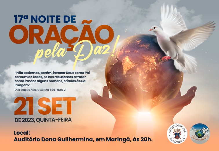Noite de Oração pela Paz acontecerá no dia 21 de setembro de 2023, quinta-feira, no Auditório Dona Guilhermina, em Maringá, com início às 20h.