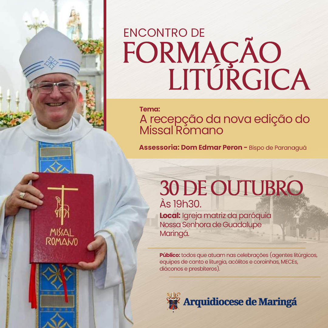 Serão 3 formações nas cidades de Maringá, Jandaia do Sul e Nova Esperança, assessoradas por Dom Edmar Peron, bispo de Paranaguá. Toda a comunidade pode participar, mas são especialmente convidados os que atuam nas celebrações (agentes litúrgicos, equipes de canto e liturgia, acólitos e coroinhas, MECEs, diáconos e presbíteros). A formação é gratuita e há formulário para inscrição. As inscrições não são obrigatórias, mas importantes para melhor acomodação de todos os participantes.