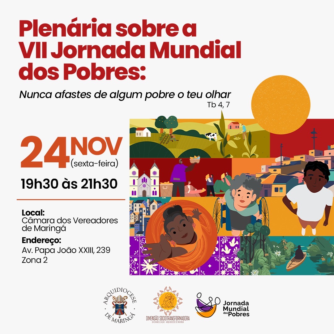 A Arquidiocese de Maringá, por meio da Dimensão Sociotransformadora da Evangelização, realizará no dia 24 de novembro (sexta-feira), uma Plenária sobre a VII Jornada Mundial dos Pobres, na Câmara dos Vereadores de Maringá, com início às 19h30.