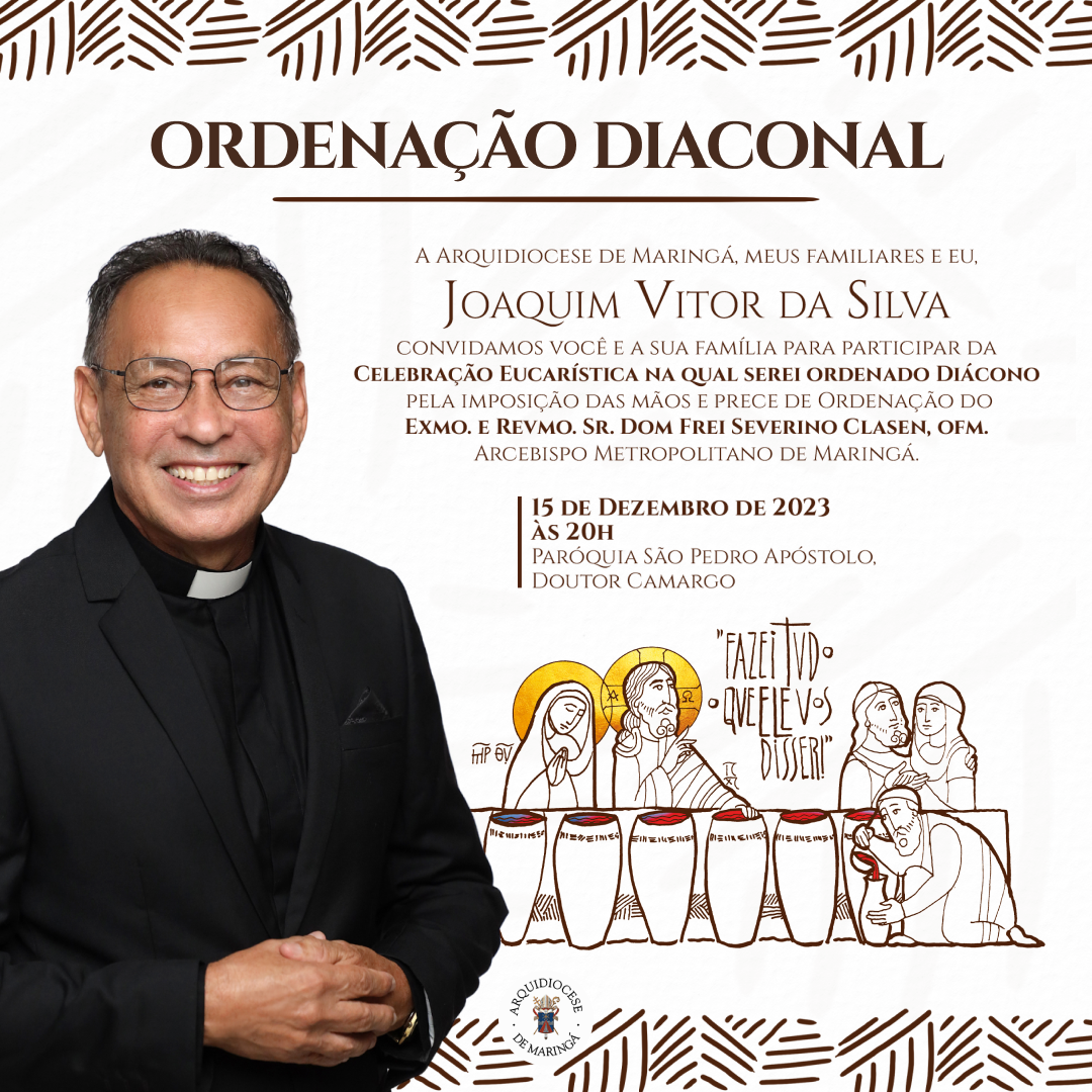 A Arquidiocese de Maringá convida para a ordenação diaconal de Joaquim Vitor da Silva. A celebração presidida pelo Arcebispo Metropolitano Dom Frei Severino Clasen, OFM, será realizada sexta-feira, 15 de dezembro, às 20h, na igreja matriz da Paróquia São Pedro Apóstolo, em Doutor Camargo.