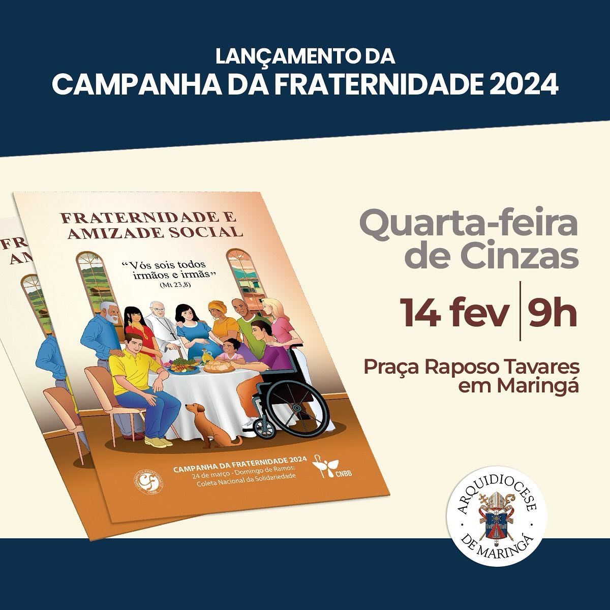 A Praça Raposo Tavares foi o local escolhido para abrigar o cerimonial de lançamento da Campanha da Fraternidade 2024, em Maringá. Na Quarta-feira de Cinzas, 14 de fevereiro, dia em que se inicia a Quaresma, a Igreja Católica dá início à Campanha da Fraternidade, que este ano tem como tema “Fraternidade e amizade social” e o lema “Vós sois todos irmãos e irmãs” (Mt 23,8). O cerimonial de lançamento terá início às 9h.