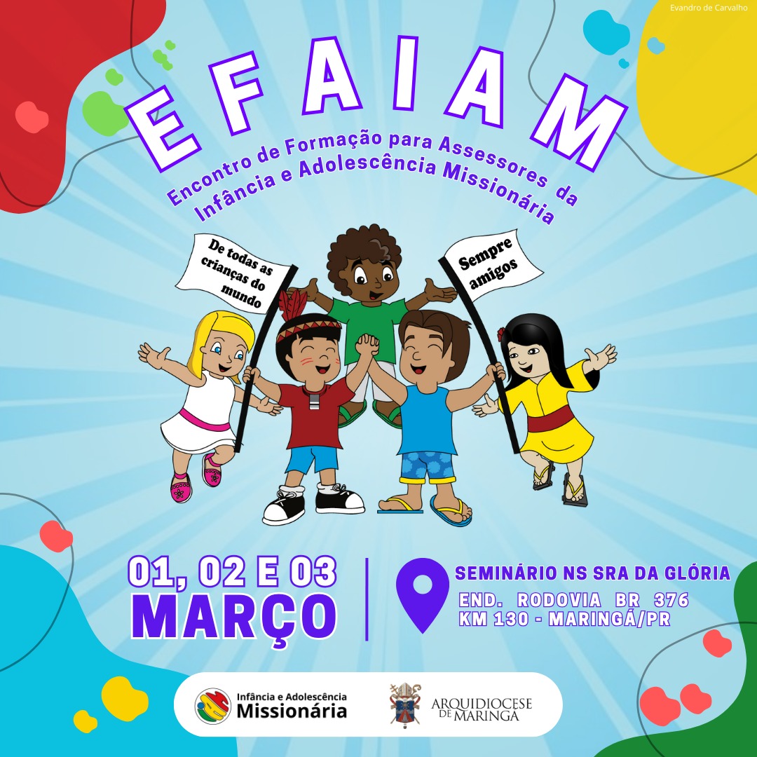 Nos dias 1°, 02 e 03 de março a Juventude Missionária (JM) irá realizar encontro de formação para jovens que queiram fazer parte da JM. A Infância Missionária também irá realizar a formação para assessores que já fazem parte da IAM ou que queiram iniciar em sua paróquia.