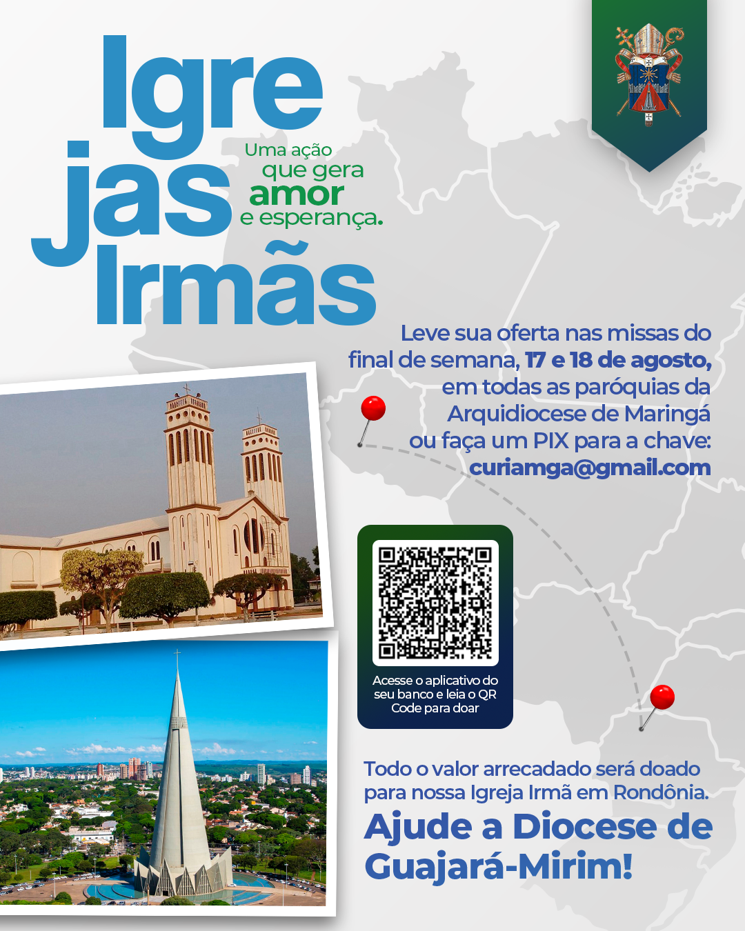 No final de semana dos dias 17 e 18 de agosto, as coletas das missas em todas as 59 paróquias da Arquidiocese de Maringá serão destinadas à Diocese de Guajará-Mirim, Rondônia.