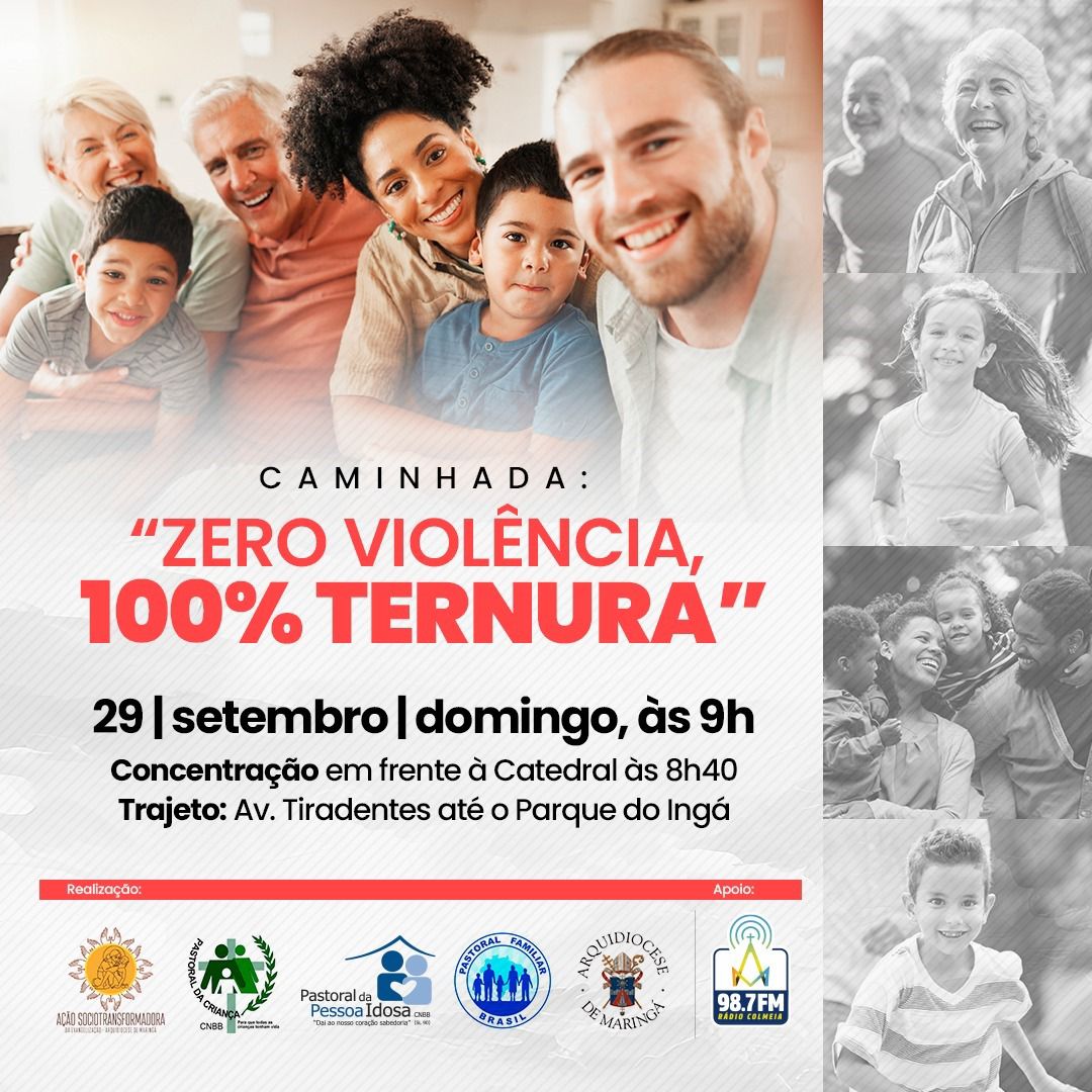 Tendo em vista estas datas celebrativas, e os desafios ainda enfrentados por crianças, adolescentes e idosos que frequentemente são vítimas de maus-tratos e abusos de todas as formas, a Arquidiocese de Maringá promoverá no dia 29 setembro, a Caminhada “Zero violência, 100% ternura” com o objetivo de sensibilizar a população para enfrentar estes contextos e promover a cultura do cuidado, do amor e da paz.