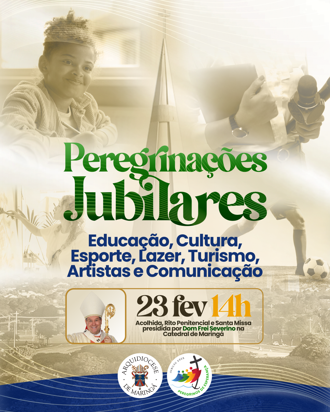 Por ocasião do Jubileu dos 2025 anos do nascimento de Jesus Cristo, a Arquidiocese de Maringá realizará peregrinações jubilares na Catedral Nossa Senhora da Glória, com o objetivo de renovar a fé, praticar a esperança e viver a caridade.O arcebispo dom Frei Severino Clasen presidirá celebrações com grupos específicos, uma por mês, de fevereiro a outubro. A primeira será no domingo, 23 de fevereiro, às 14h, destinada à Educação, Cultura, Esporte, Lazer, Turismo, Artistas e Comunicação.Trabalhadores de todas essas áreas estão convidados a participar e celebrar juntos o Jubileu de Esperança