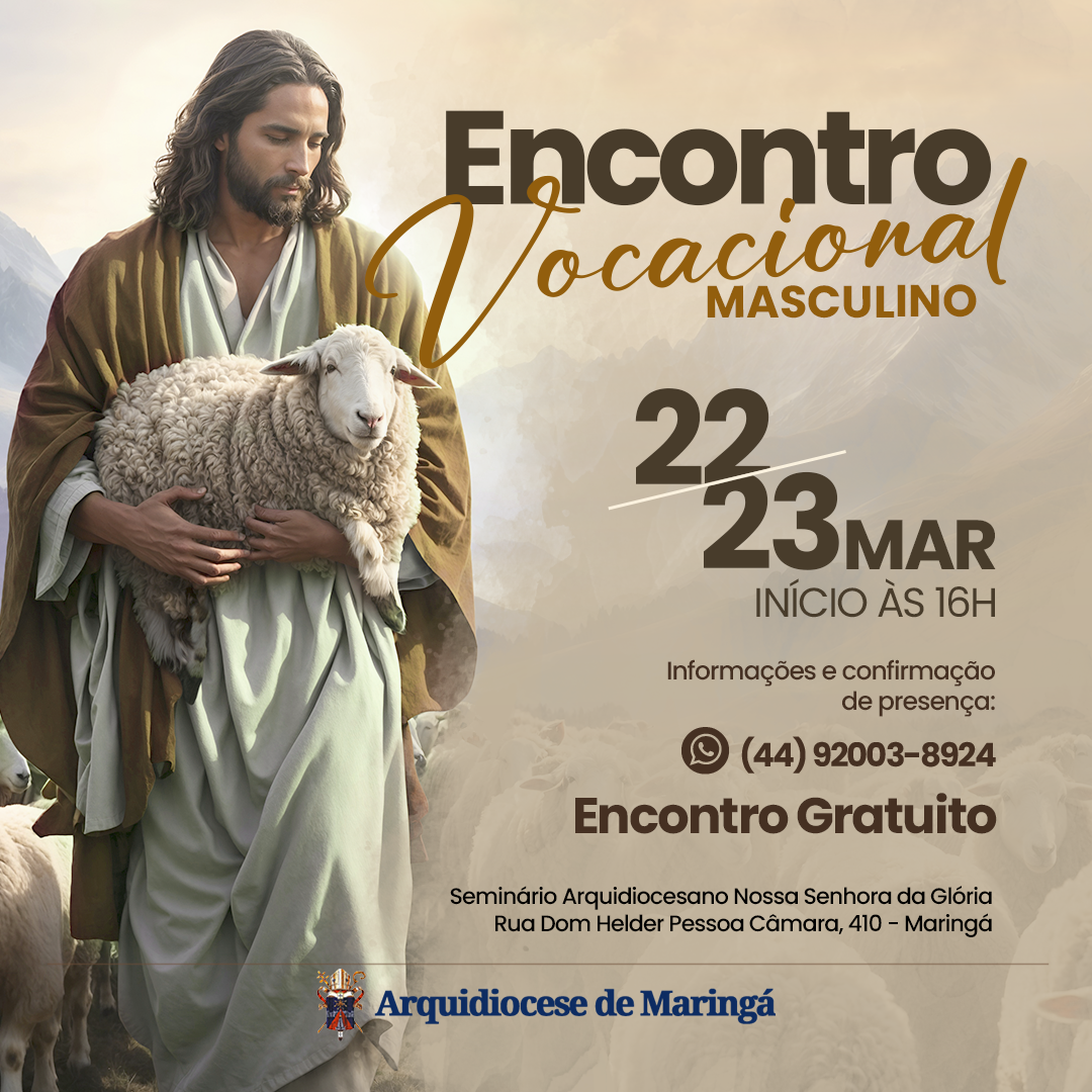 Nos dias 22 e 23 de março, a Arquidiocese de Maringá realizará o segundo Encontro Vocacional masculino do ano de 2025. O encontro é voltado para adolescentes, jovens e adultos que desejam ingressar no seminário para a formação presbiteral. O acompanhamento vocacional constitui uma etapa importantíssima no processo de discernimento vocacional e ingresso no seminário.