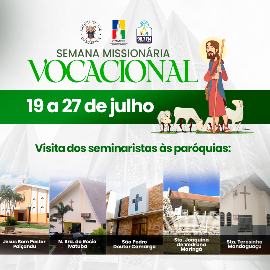 Entre os dias 19 e 27 de julho de 2025, nossos seminaristas realizarão a Semana Missionária Vocacional em cinco paróquias da Arquidiocese de Maringá. Durante esse período, eles participarão de encontros nas comunidades paroquiais, como momentos com jovens, catequese, farão visitas aos doentes, celebrações em comunidades e condomínios, além de ações missionárias em repartições públicas.