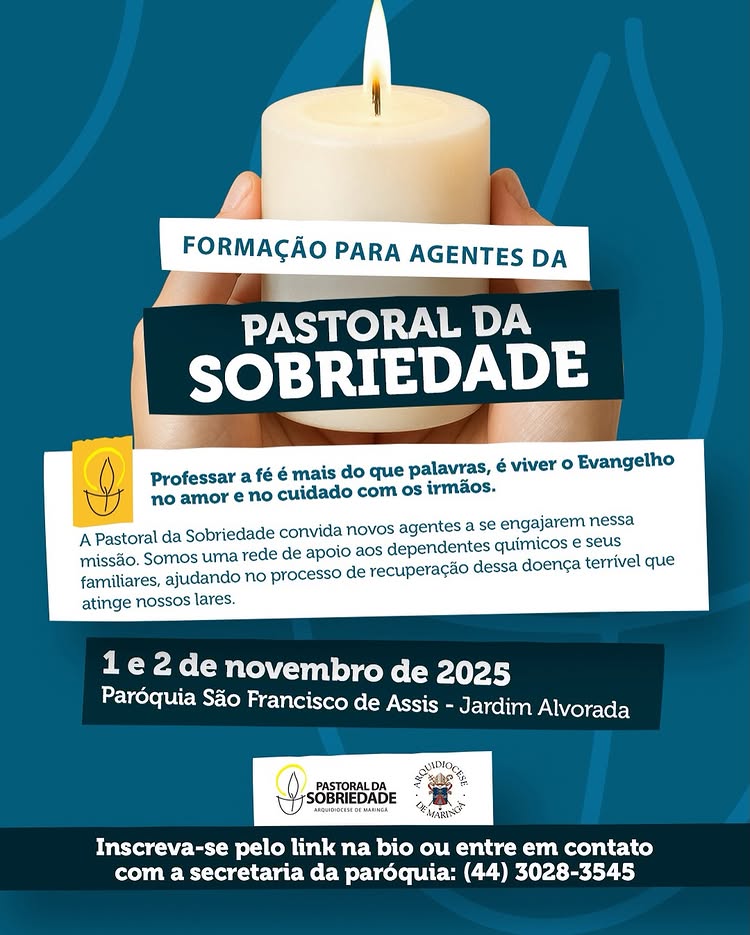 A Arquidiocese de Maringá convida para a formação de novos agentes da Pastoral da Sobriedade, um serviço da Igreja que atua na acolhida, prevenção e recuperação de pessoas e famílias que enfrentam o desafio da dependência química e outras compulsões.