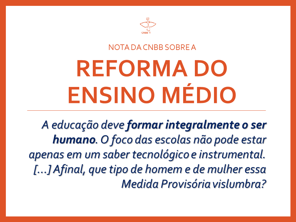 A Conferência Nacional dos Bispos do Brasil, por meio do Conselho Episcopal Pastoral (Consep), reunido na sede da entidade, em Brasília (DF), nos dias 22 e 23 de novembro, aprovou a nota sobre a chamada "Reforma do Ensino Médio", apresentada pelo Governo Federal ao Congresso Nacional na forma de Medida Provisória. Para os bispos, são louváveis as iniciativas que busquem refletir, debater e aprimorar a realidade do ensino brasileiro, mas "assim como outras propostas recentes, também essa sofre os limites de uma busca apressada de solução". A entidade acredita que "questão tão nobre quanto a Educação não pode se limitar à reforma do Ensino Médio. Antes, requer amplo debate com a sociedade organizada, particularmente com o mundo da educação. É a melhor forma de legitimação para medidas tão fundamentais".