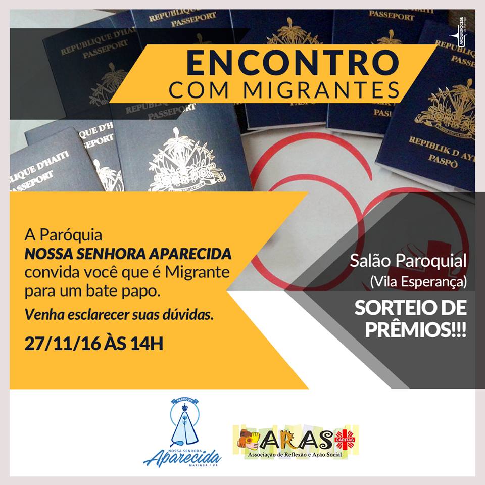 A Aras-Cáritas (Associação de Reflexão e Ação Social) realizará no próximo domingo (27) Encontro com migrantes no salão paroquial da paróquia Nossa Senhora Aparecida (Vila Esperança).