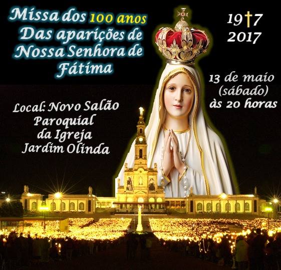 A comunidade de Jardim Olinda-PR irá celebrar os 100 anos das aparições de Nossa Senhora de Fátima com a santa missa no novo salão paroquial da igreja matriz. A celebração será realizada às 20h no dia 13 de maio.