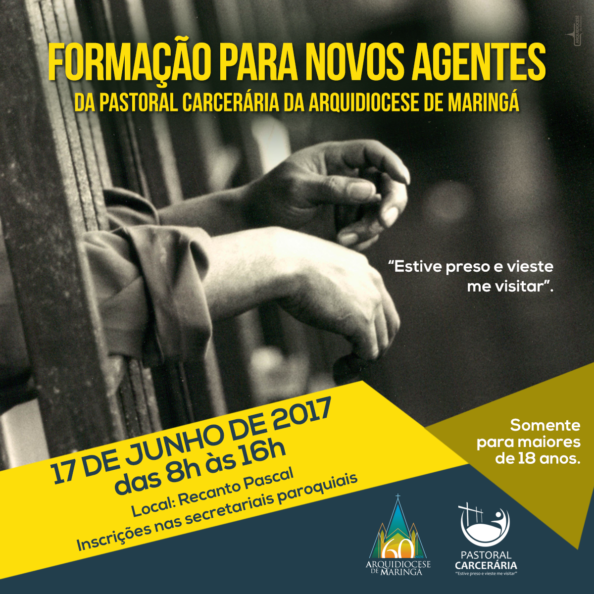 A Pastoral Carcerária da Arquidiocese de Maringá promoverá formação para novos agentes no dia 17 de junho das 8h às 16h no Recanto Pascal – saída para Campo Mourão.